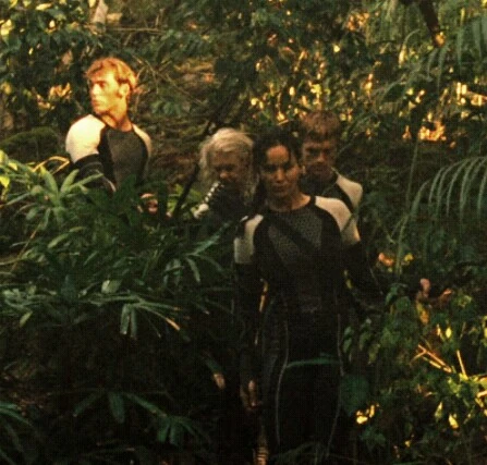 Финник, Мэгз, Пит и Китнисс в первые часы игр в джунглях