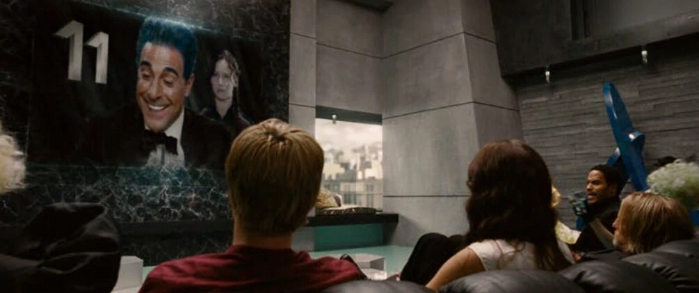 Президент Сноу смотрит на трансляцию возвращения Пита и Китнисс домой. Он недоволен!