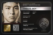 На параде трибутов юноша был одет в белый костюм с элементами оригами. Он символизировал деревообрабатывающую промышленность дистрикта 7.