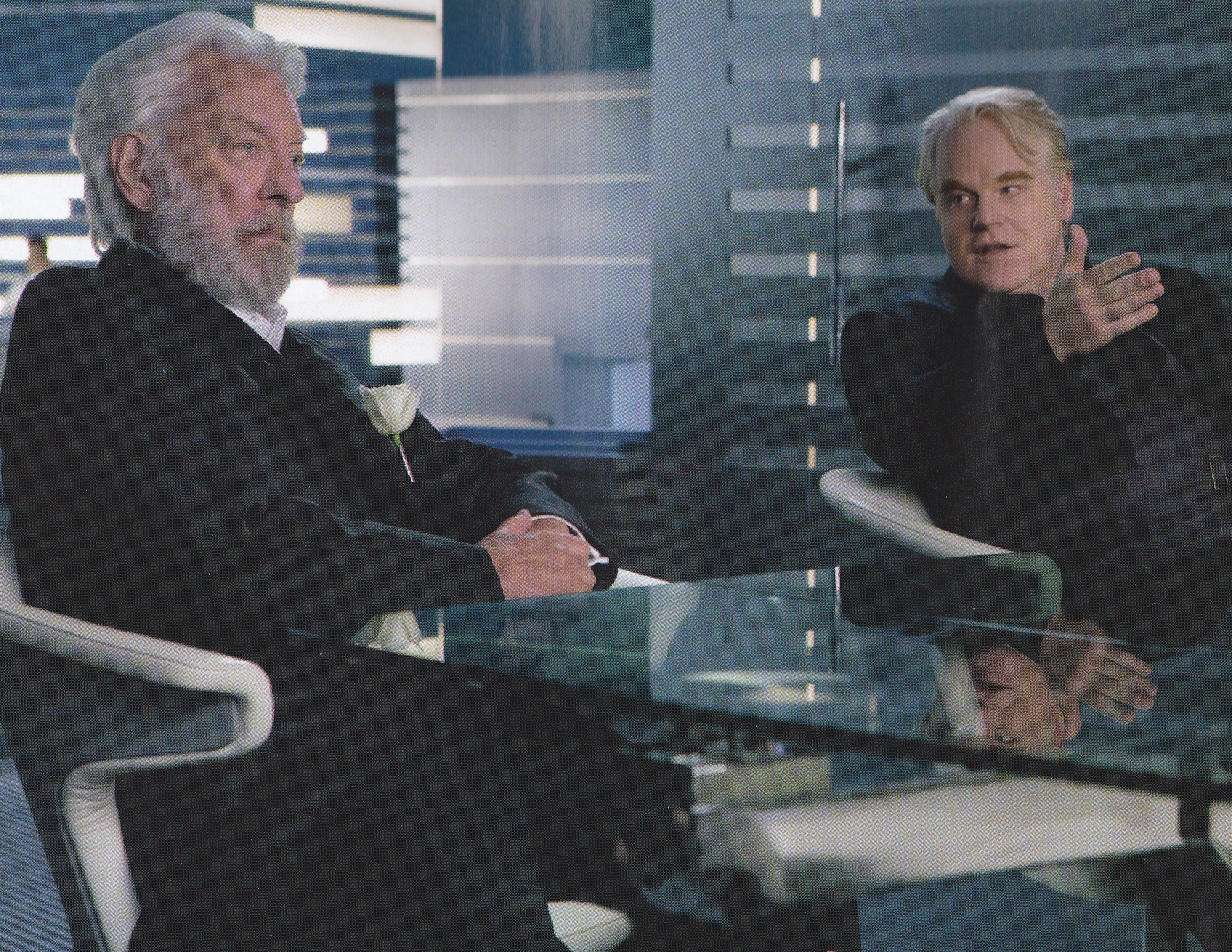 President Snow watching Katniss Everdeen's interview before her dress turned into a mockingjay.