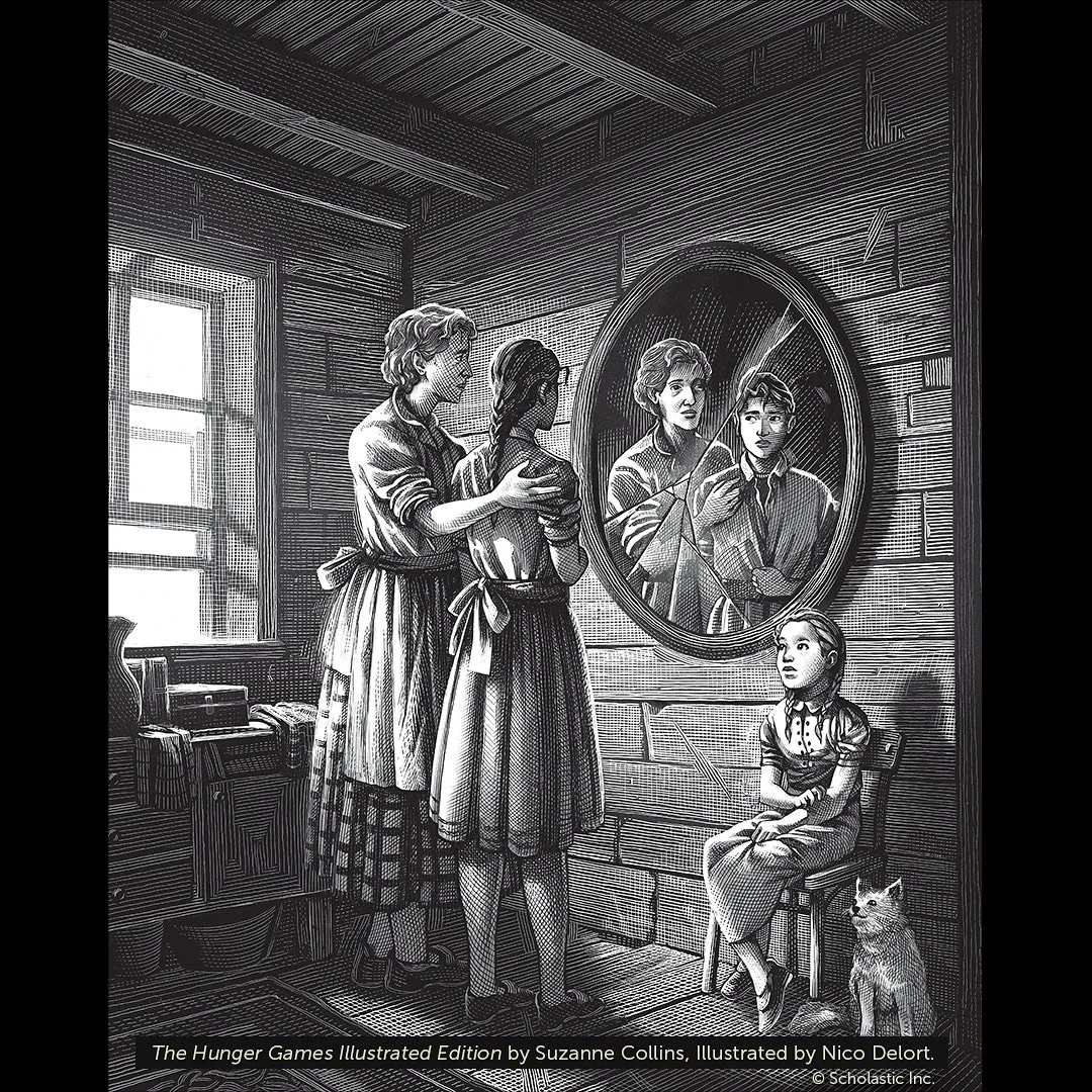 The Everdeens in front of the cracked mirror in The Hunger Games: Illustrated Edition.