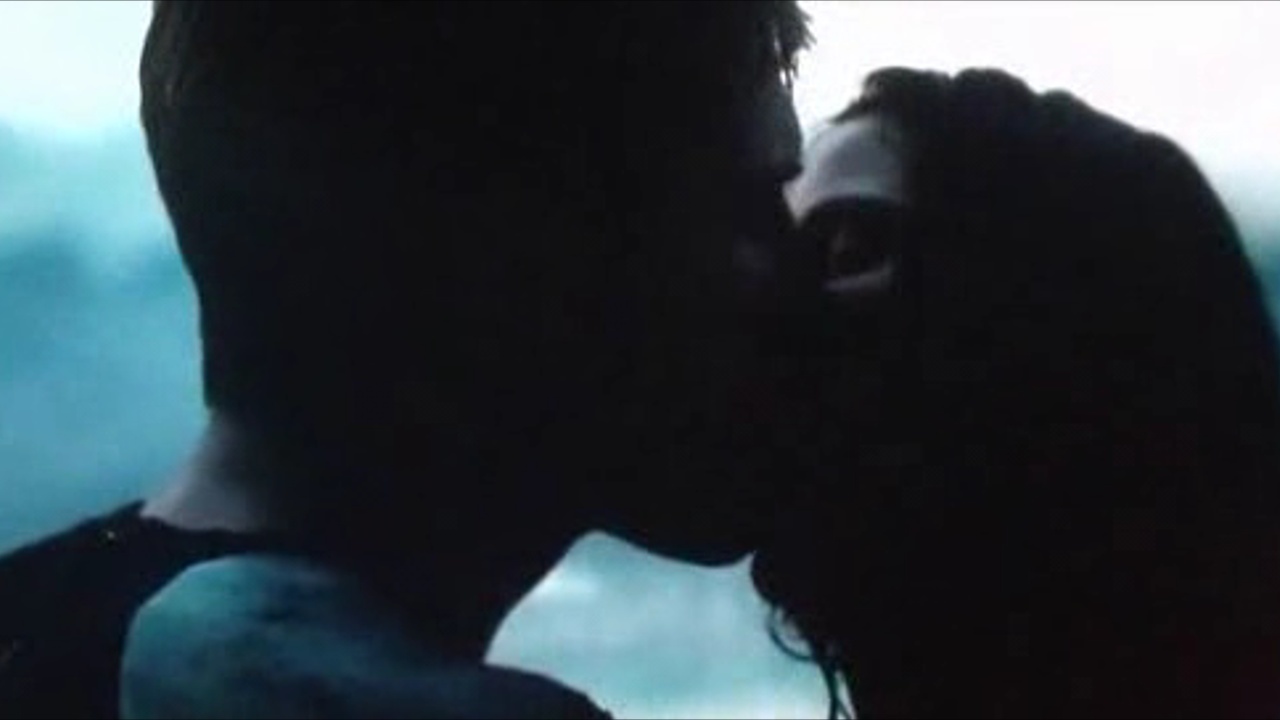 Katniss passionately kisses Peeta on the beach.