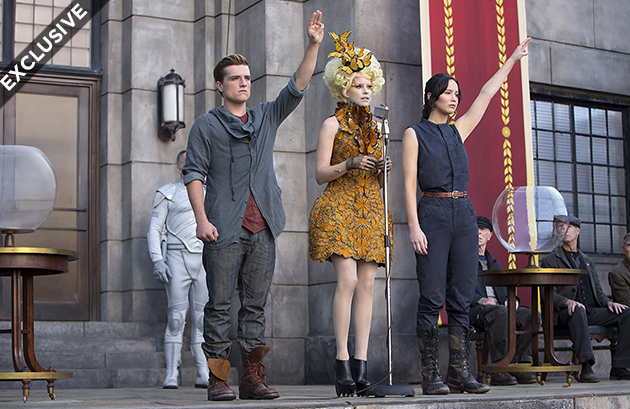 Peeta, Effie and Katniss beside the reaping balls.