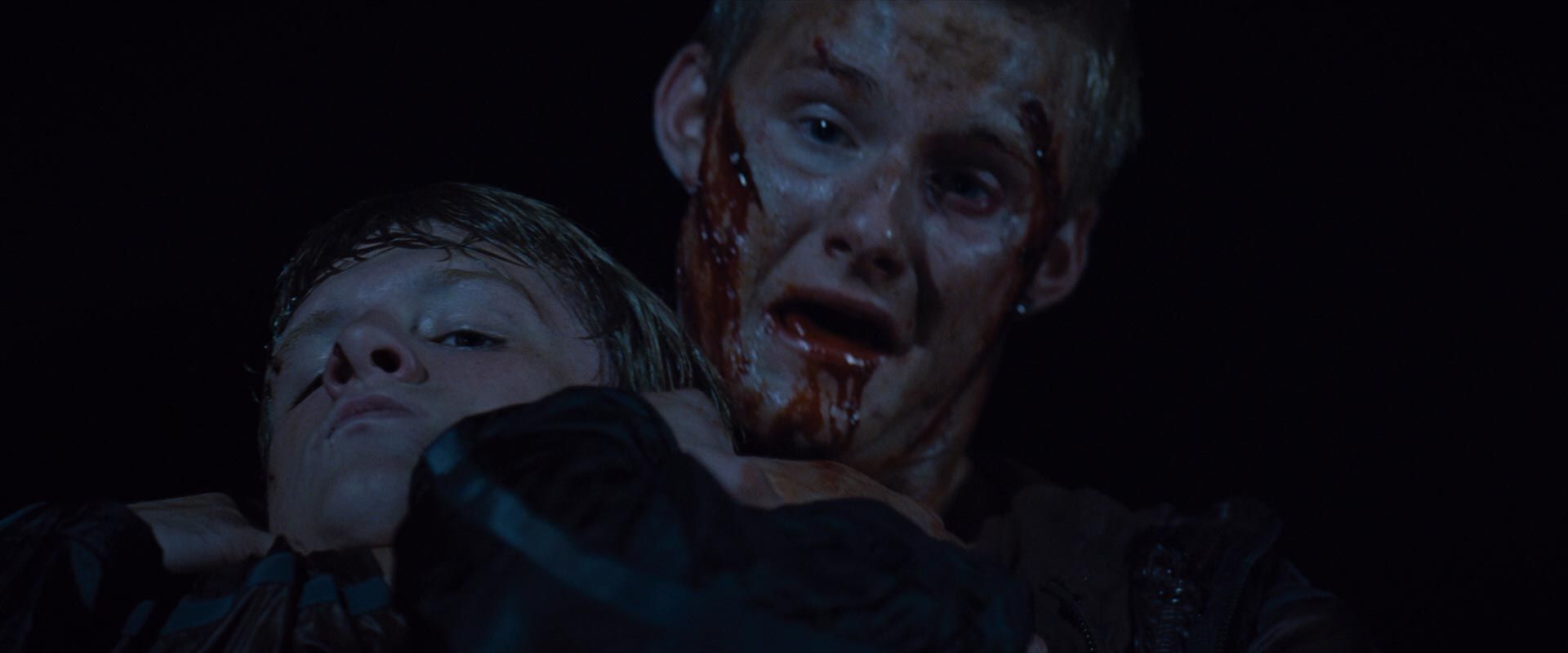 That night, wolf mutts are released into the arena to intensify the Games, killing Thresh and leaving Katniss, Peeta, and Cato as the only remaining tributes. Katniss and Peeta are chased by several mutts to the Cornucopia, where they encounter a bloodied and beaten Cato. After a brief fight, Cato holds Peeta by the neck, and Katniss notches an arrow at him. Cato confesses his regret that his only skill is his ability to kill, realizing he's become the Capitol's tool; nevertheless, he will not give up in honor of District 2. Following Peeta's gesture, Katniss fires an arrow at Cato's hand and he releases Peeta, who then pushes him off the Cornucopia, falling to the animals below.
